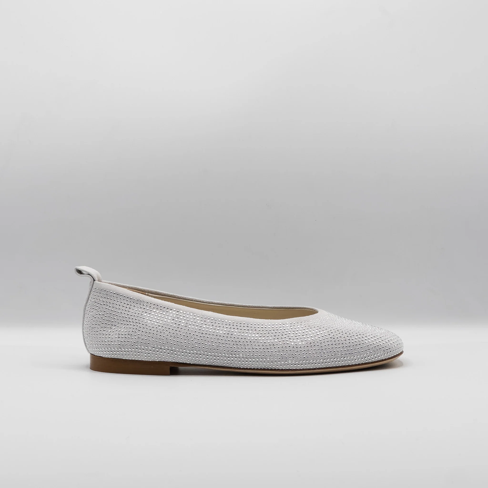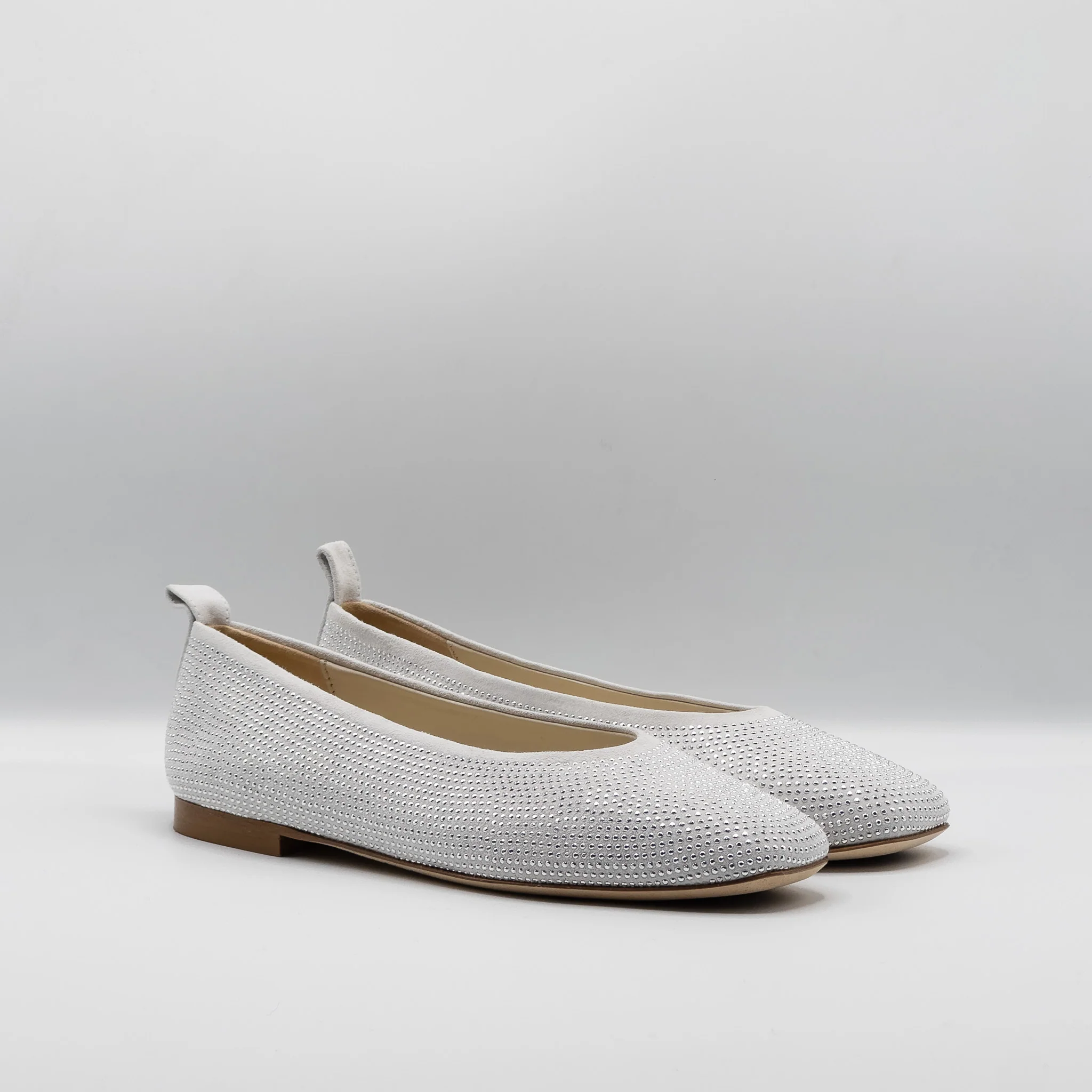 Ballerines en daim beige avec strass. Ce modèle garanti un très grand confort grâce à sa souplesse et sa coupe bien emboîtante. Made in ITALY