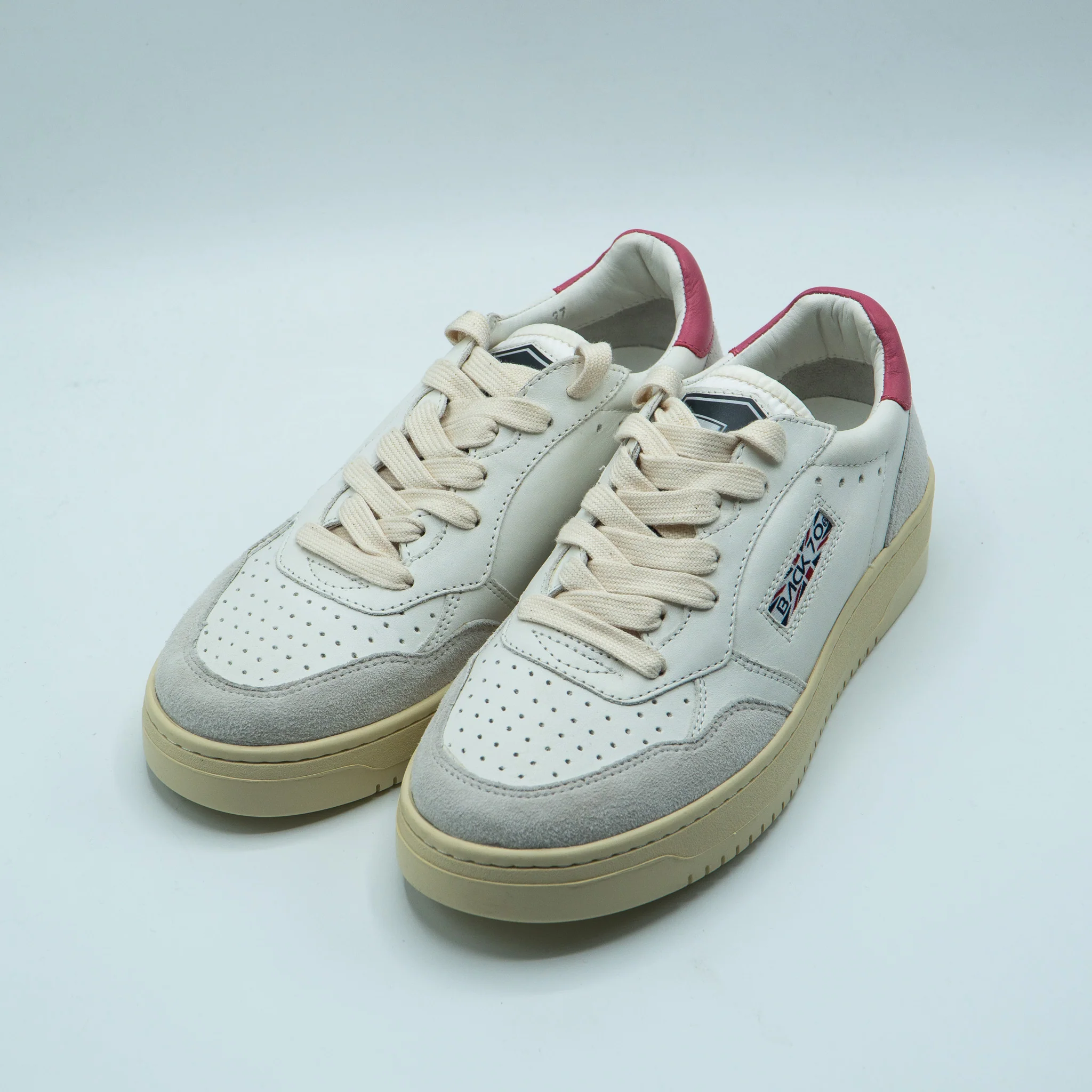 Basket en cuir blanc. Détail rose à l’arrière.