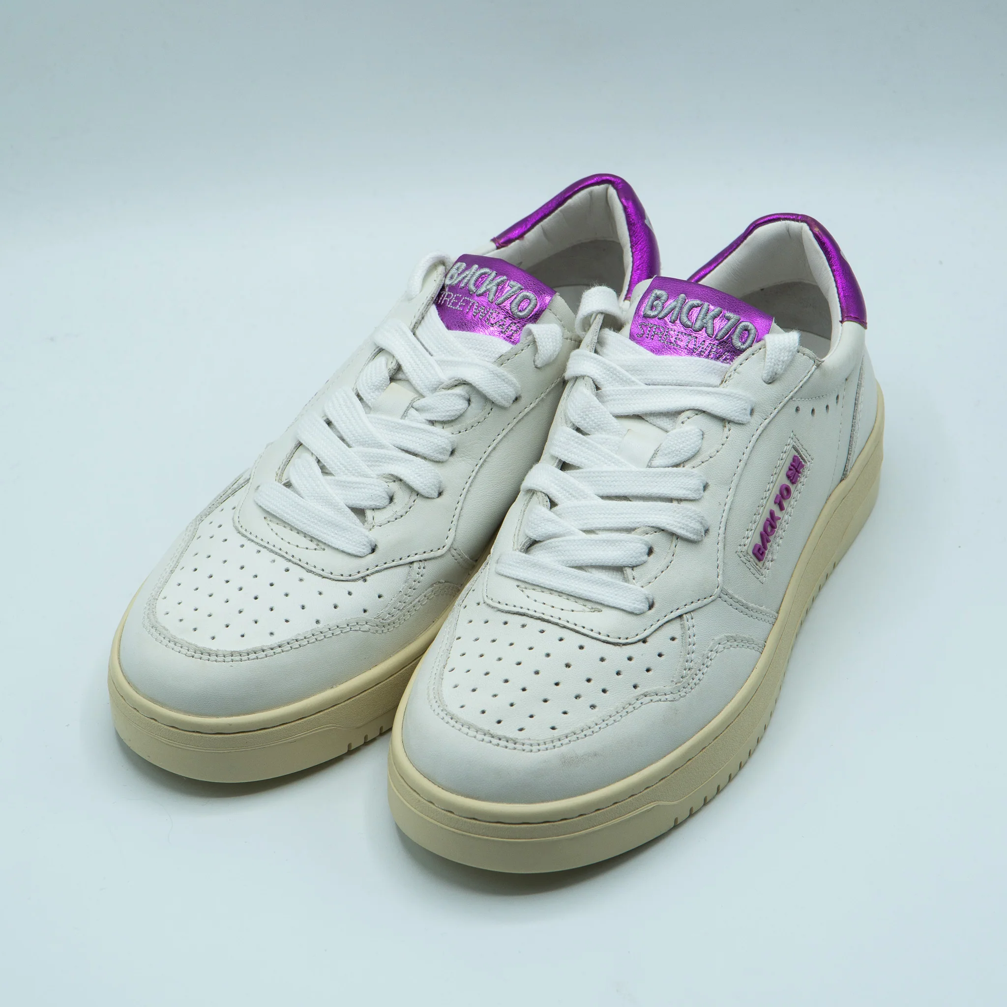 Basket en cuir blanc. Empiècement en cuir brillant violet à l’arrière.