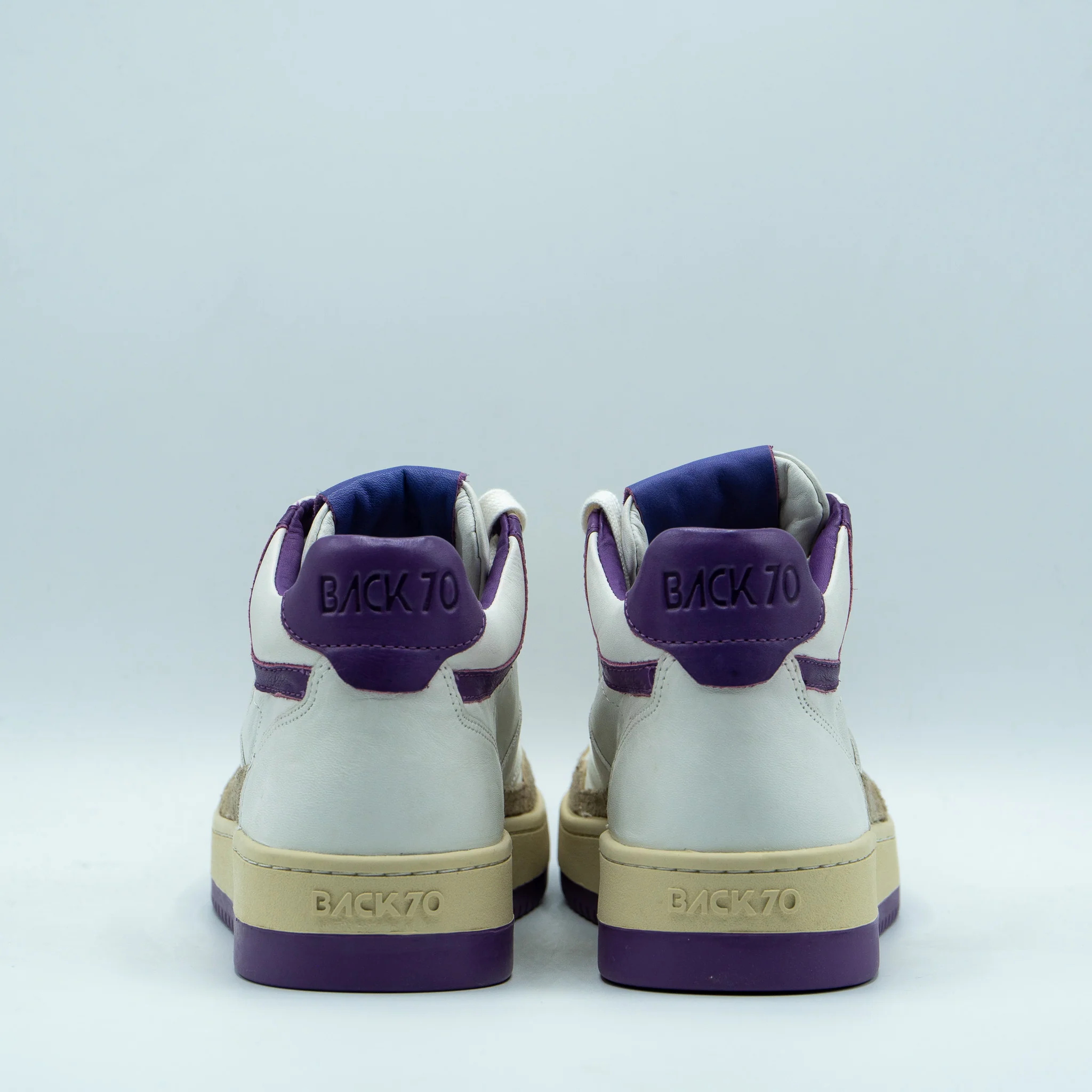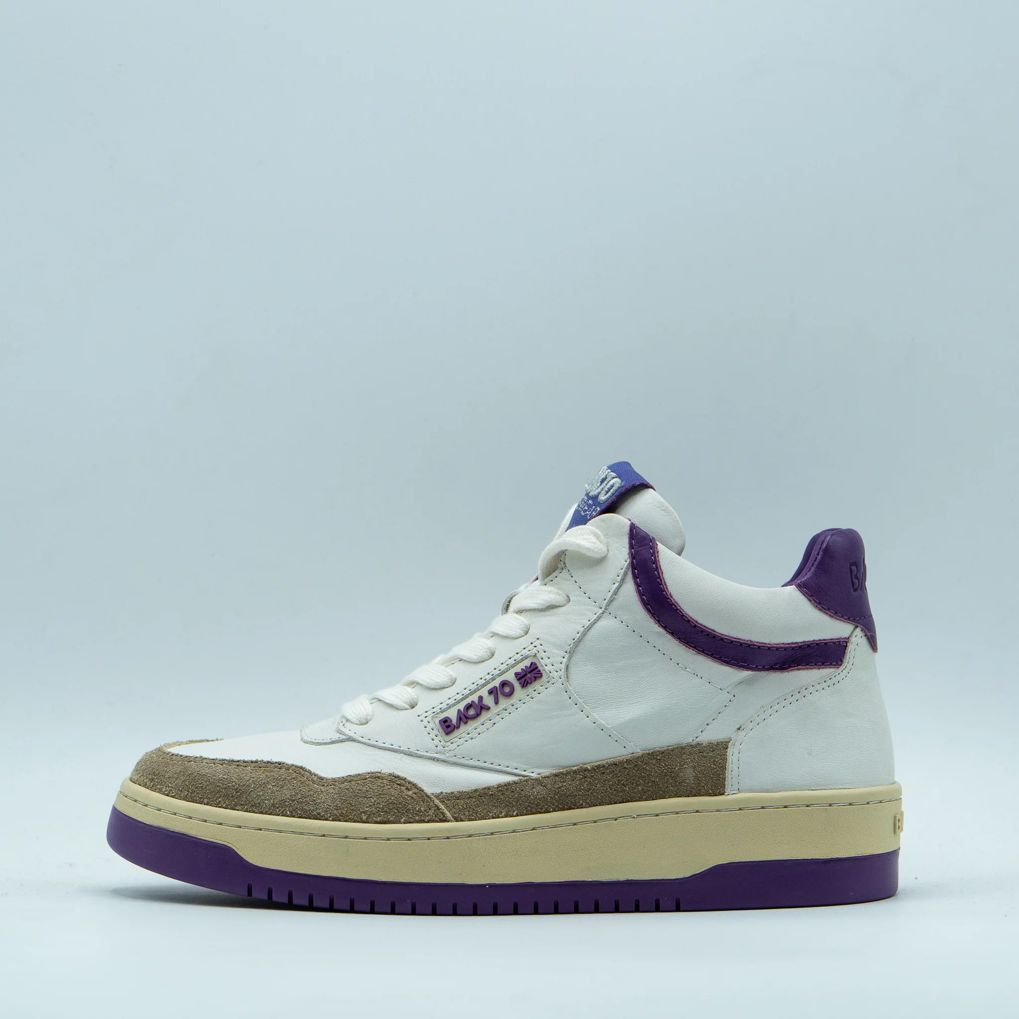 Baskets montantes en cuir blanc. Empiècements et semelle violet.