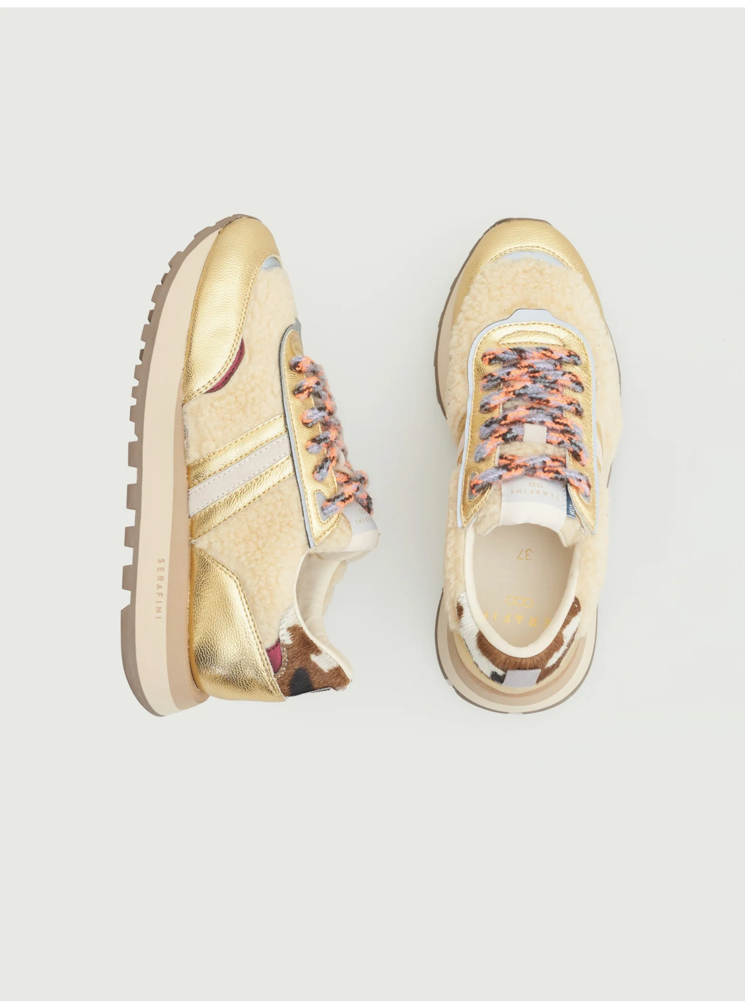 Supérieur: SHEARLING CRÈME, CUIR OR, POULAIN IMPRIMÉ VACHELanguette: SHEARLING CRÈMEDoublure: CUIR BLANCLacets: MULTICOLORE ORANGE, NOIR ET BLEU CLAIRSemelle extérieure: MICRO BEIGEPlantaire: AMOVIBLE ET RECOUVERTE DE CUIR, ASSURE UNE MARCHE AMORTIEBoîte: CARTON BLEU AVEC LOGO OR. HISTOIRE DE LA MARQUE À L’INTÉRIEUR