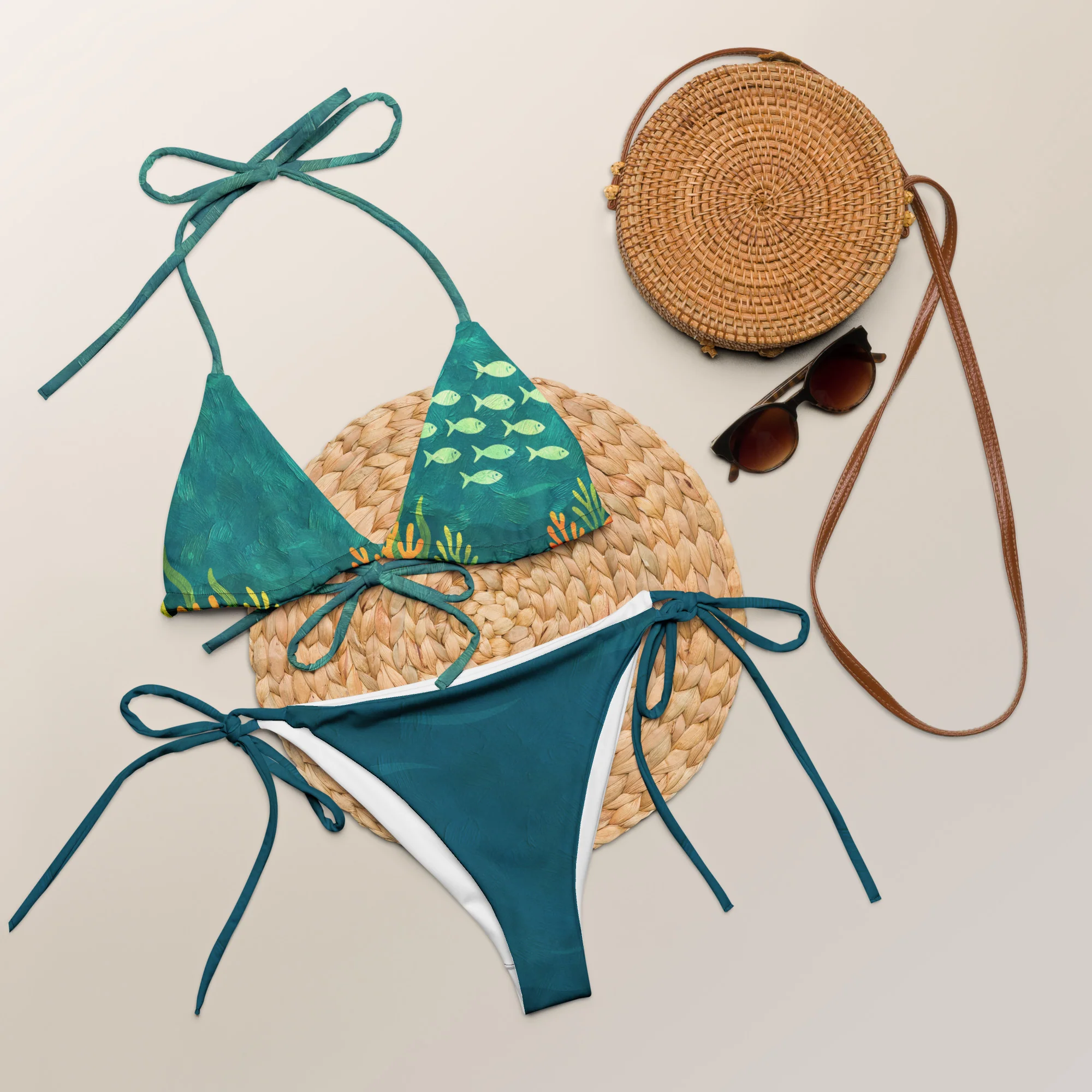 Ce bikini triangle Deep Blue s’inspire des fonds marins, avec un motif de poissons et coraux au style artistique. Ses couleurs bleu-vert mettent en valeur le bronzage et apportent une touche fraîche et estivale. Avec son imprimé original et doux, il se démarque tout en restant facile à porter. Parfait pour celles qui veulent un maillot unique, flatteur et différent.