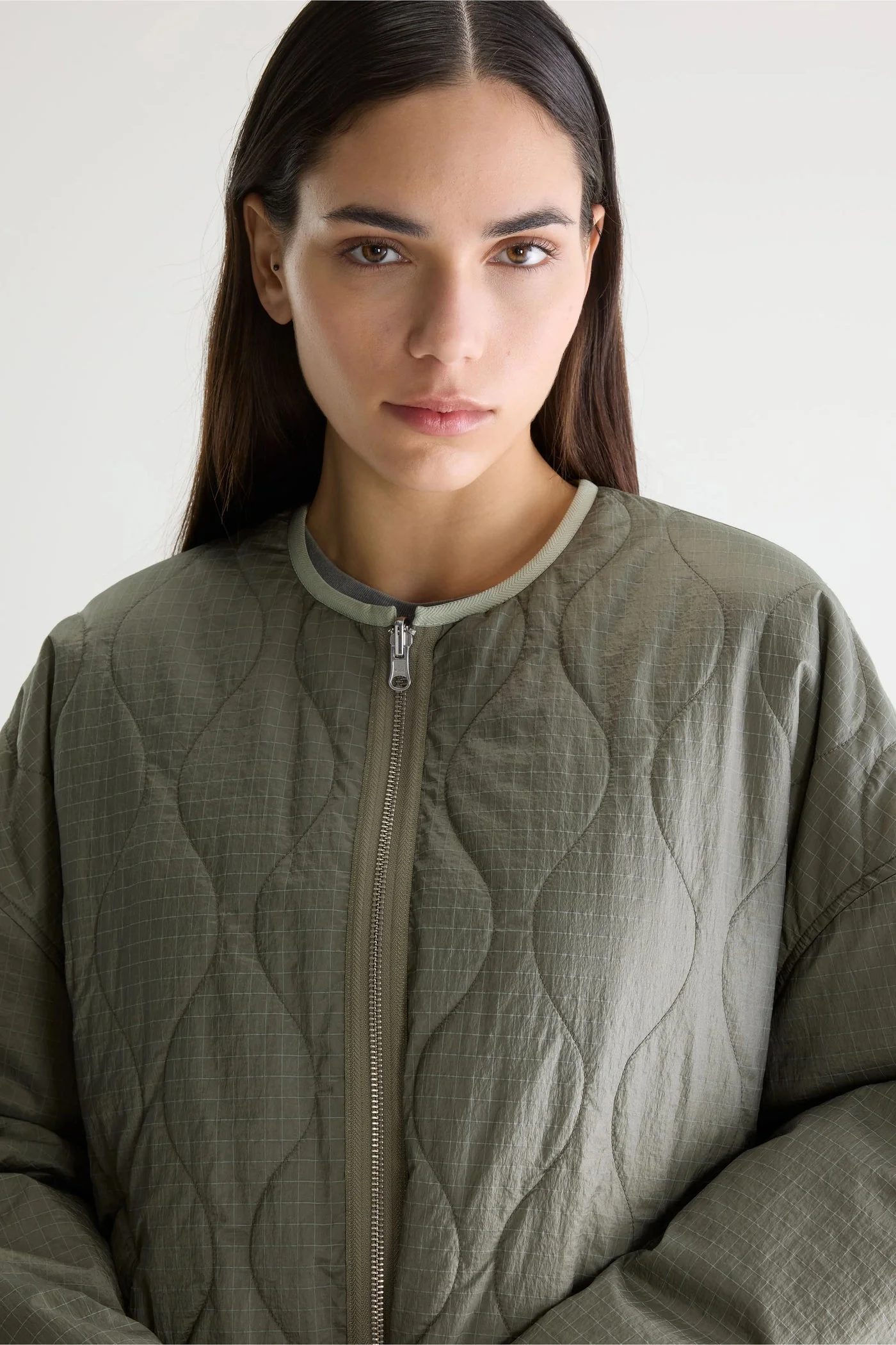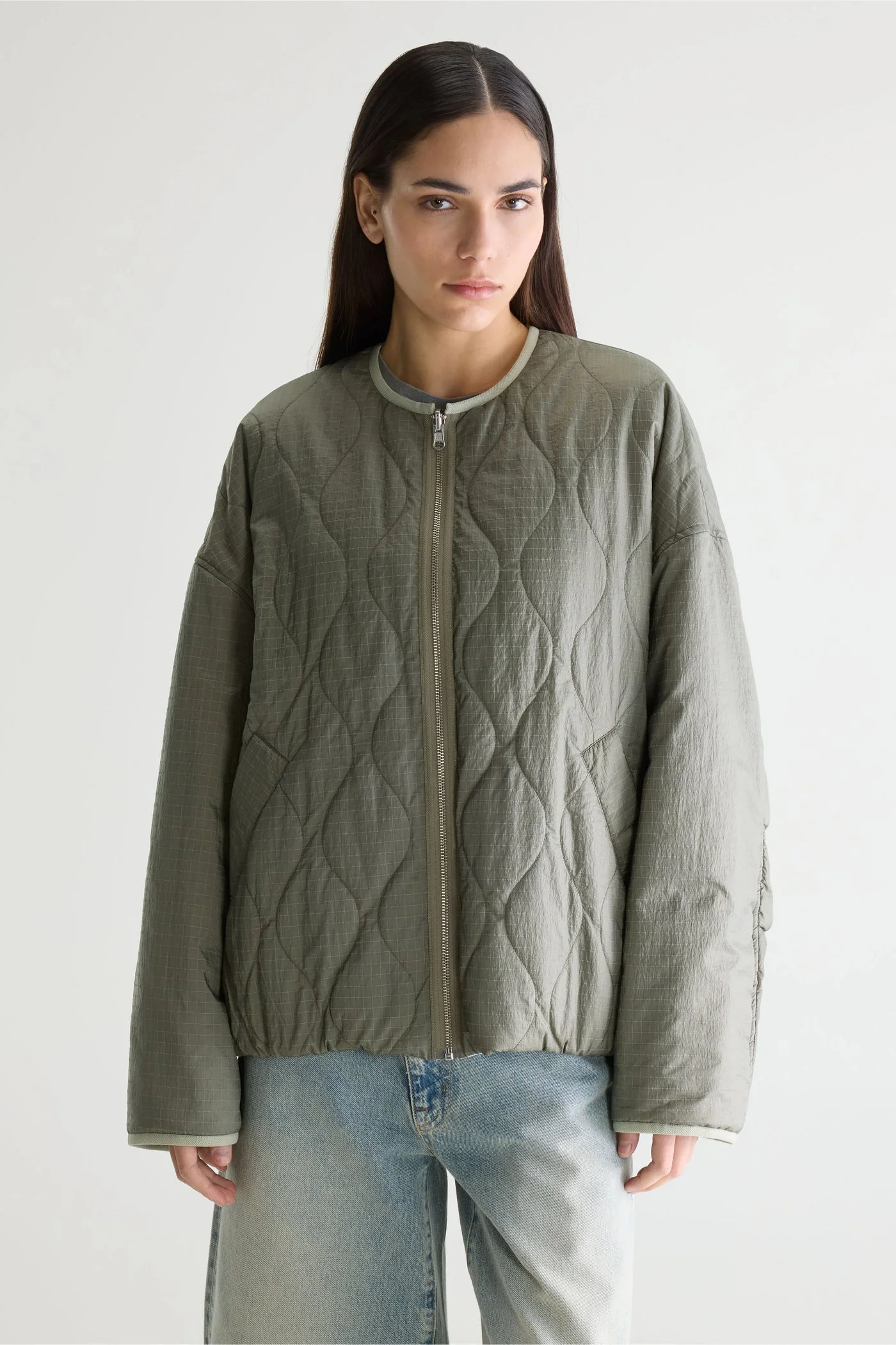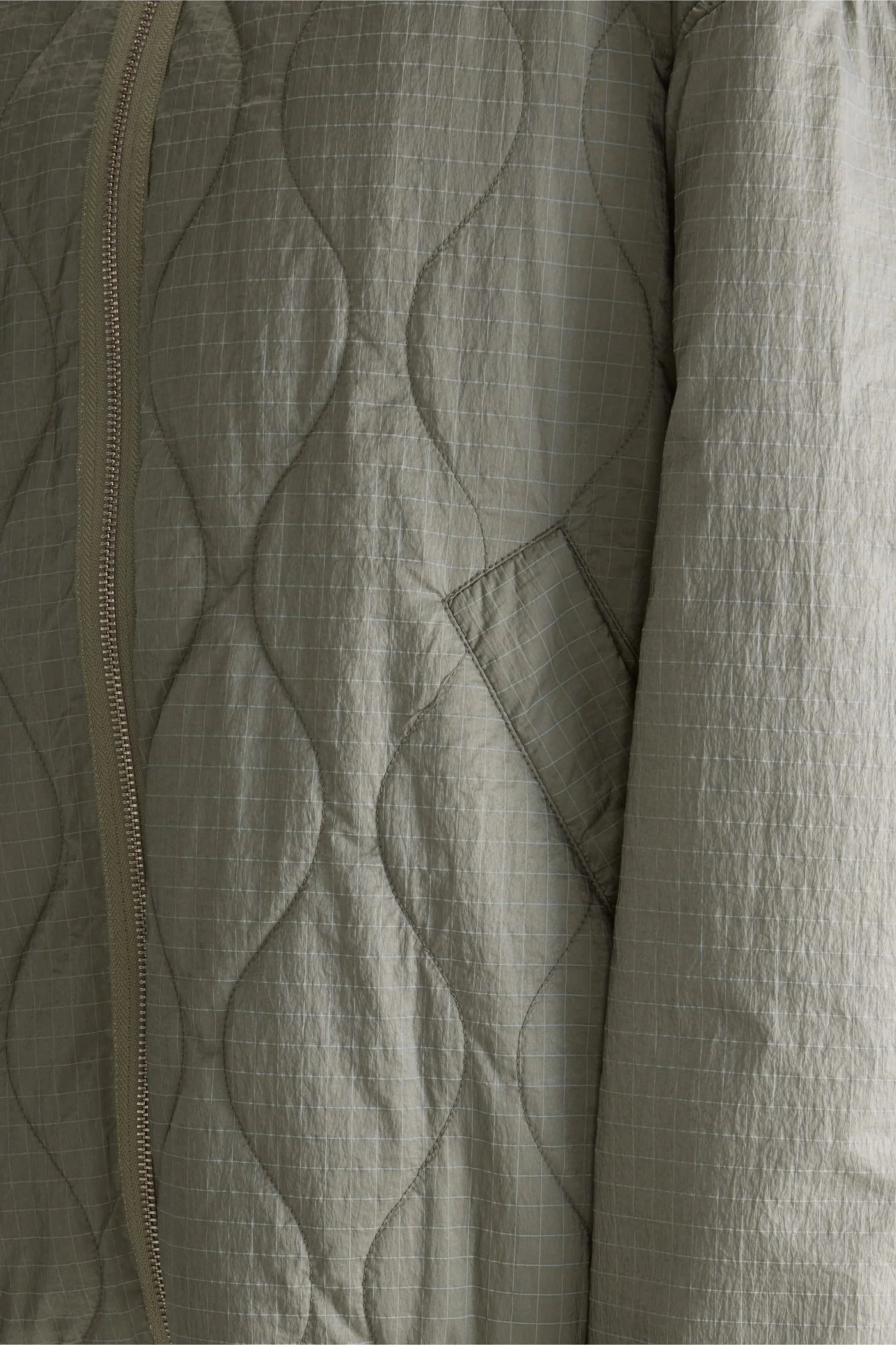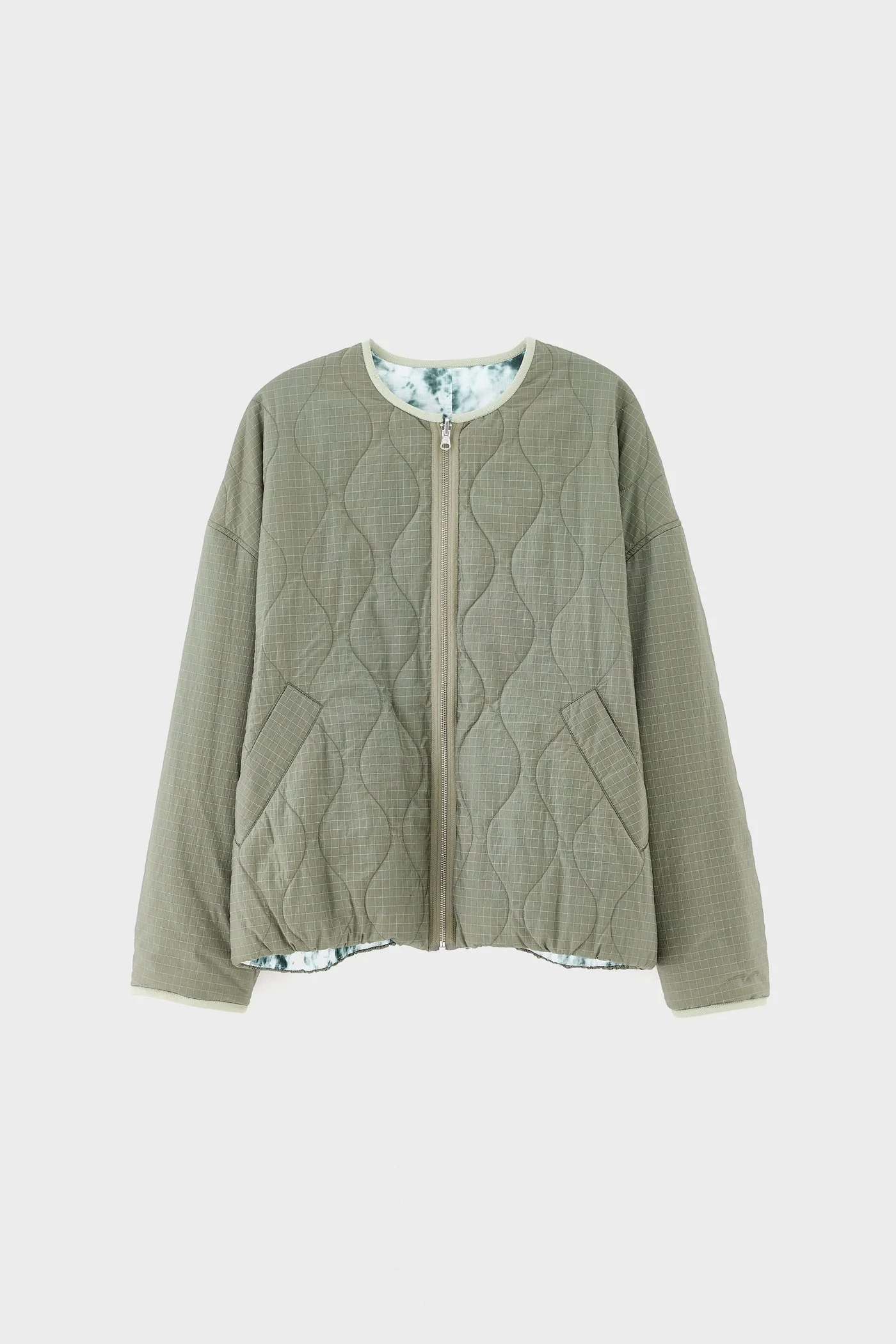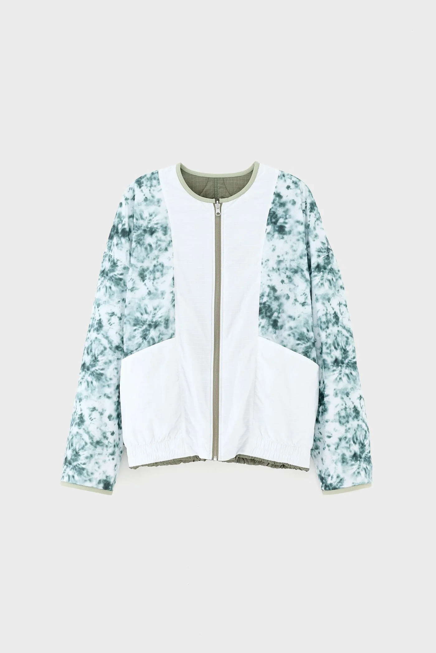 Veste réversible décontractée, avec un côté en nylon matelassé kaki et l’autre à empiècements tie-dye, finie par un ourlet élastiqué.