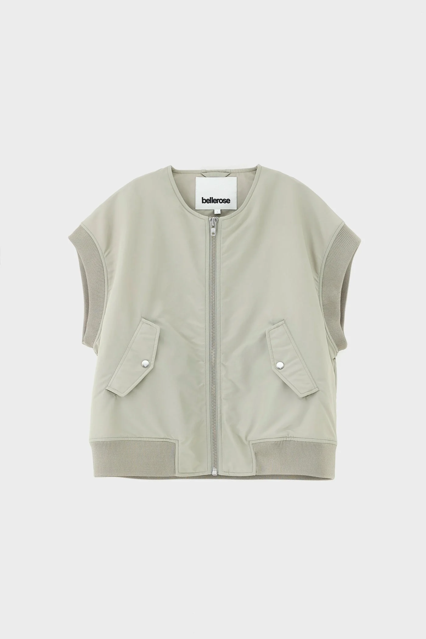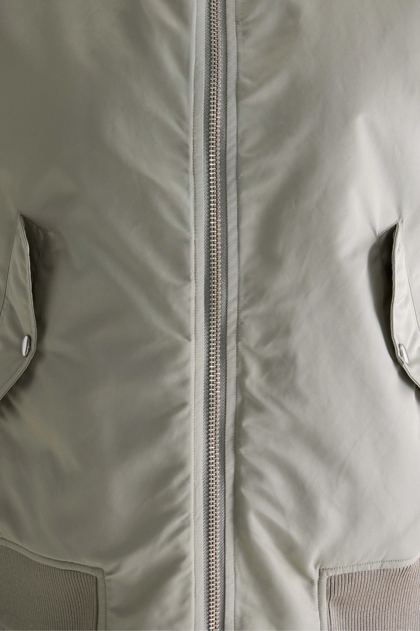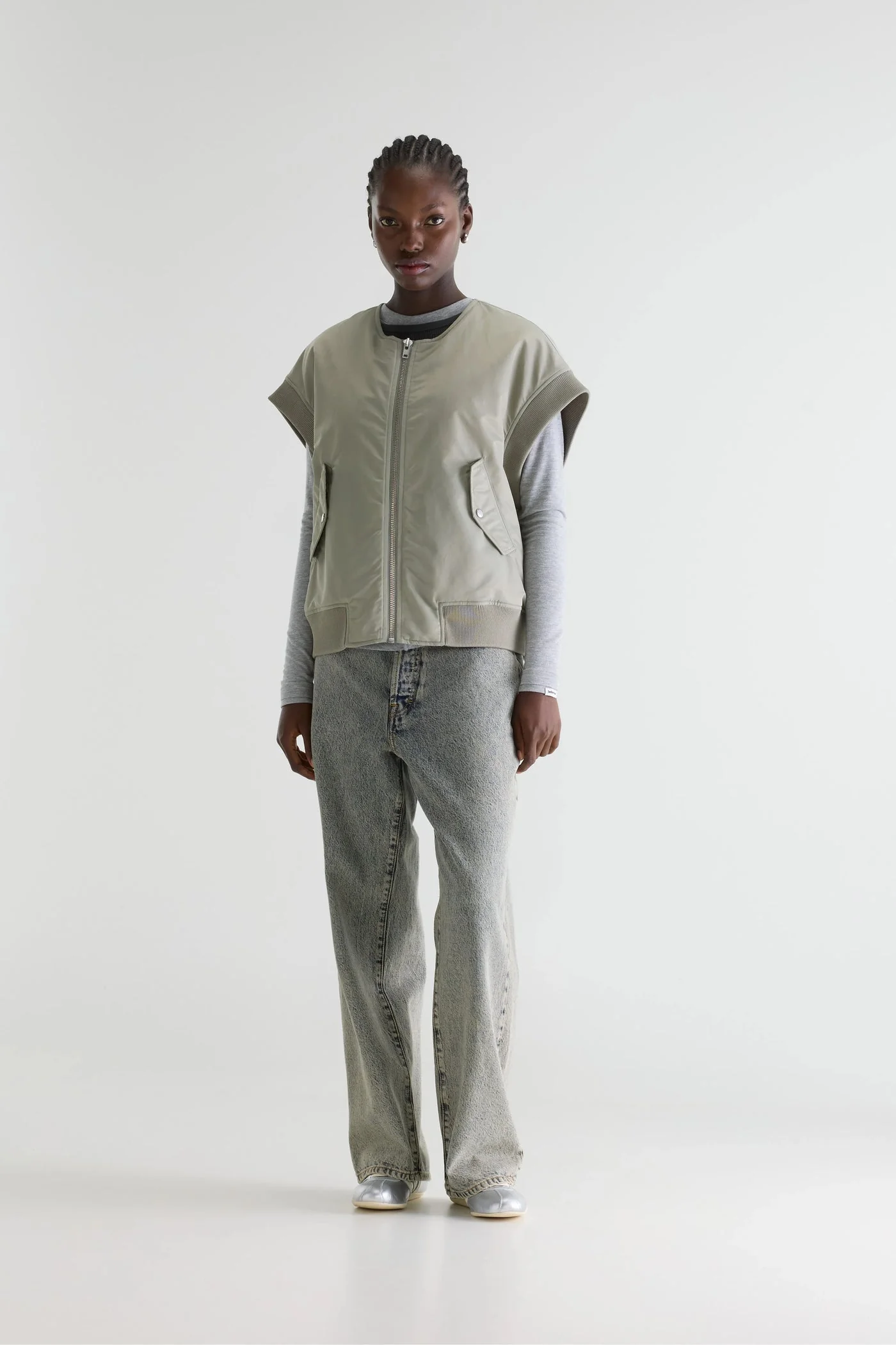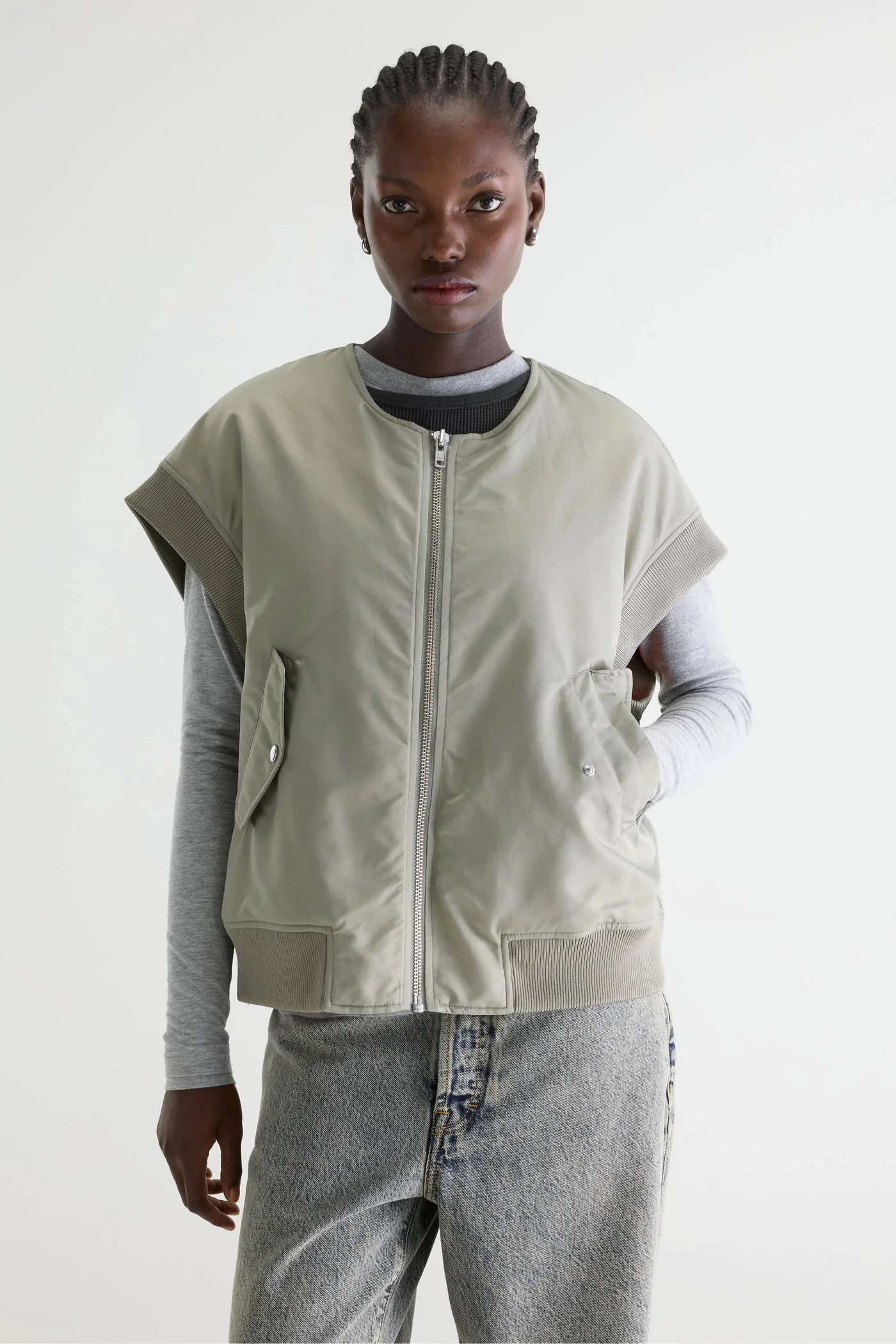 Veste bombers sans manches en nylon vert sauge avec bords côtes, poches à rabat à boutons-pression et doublure orange vif.