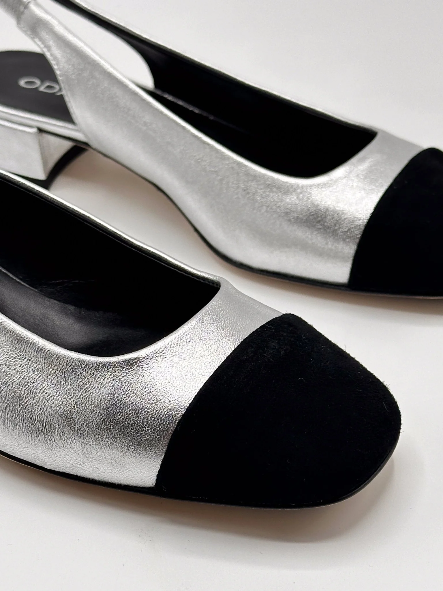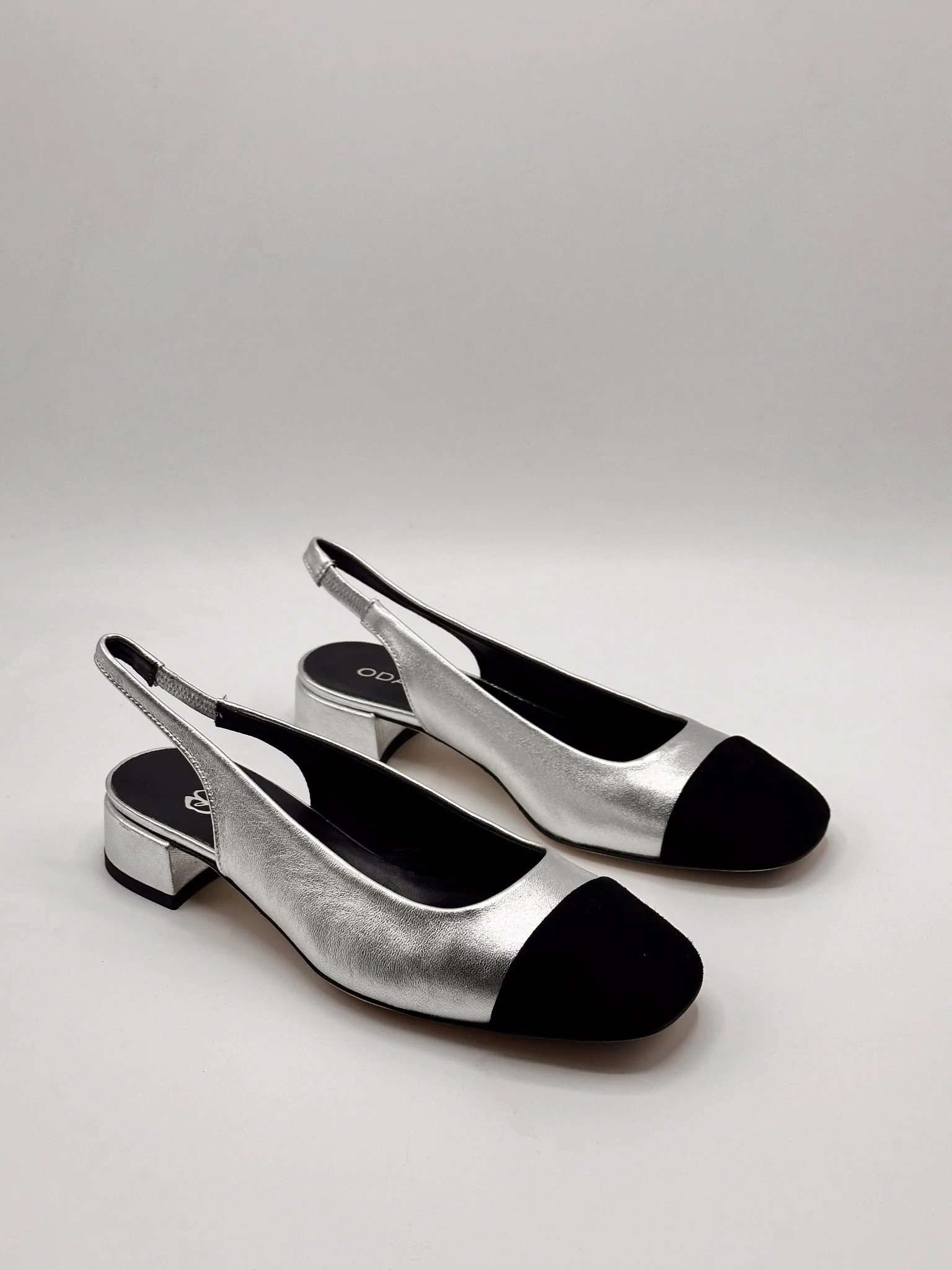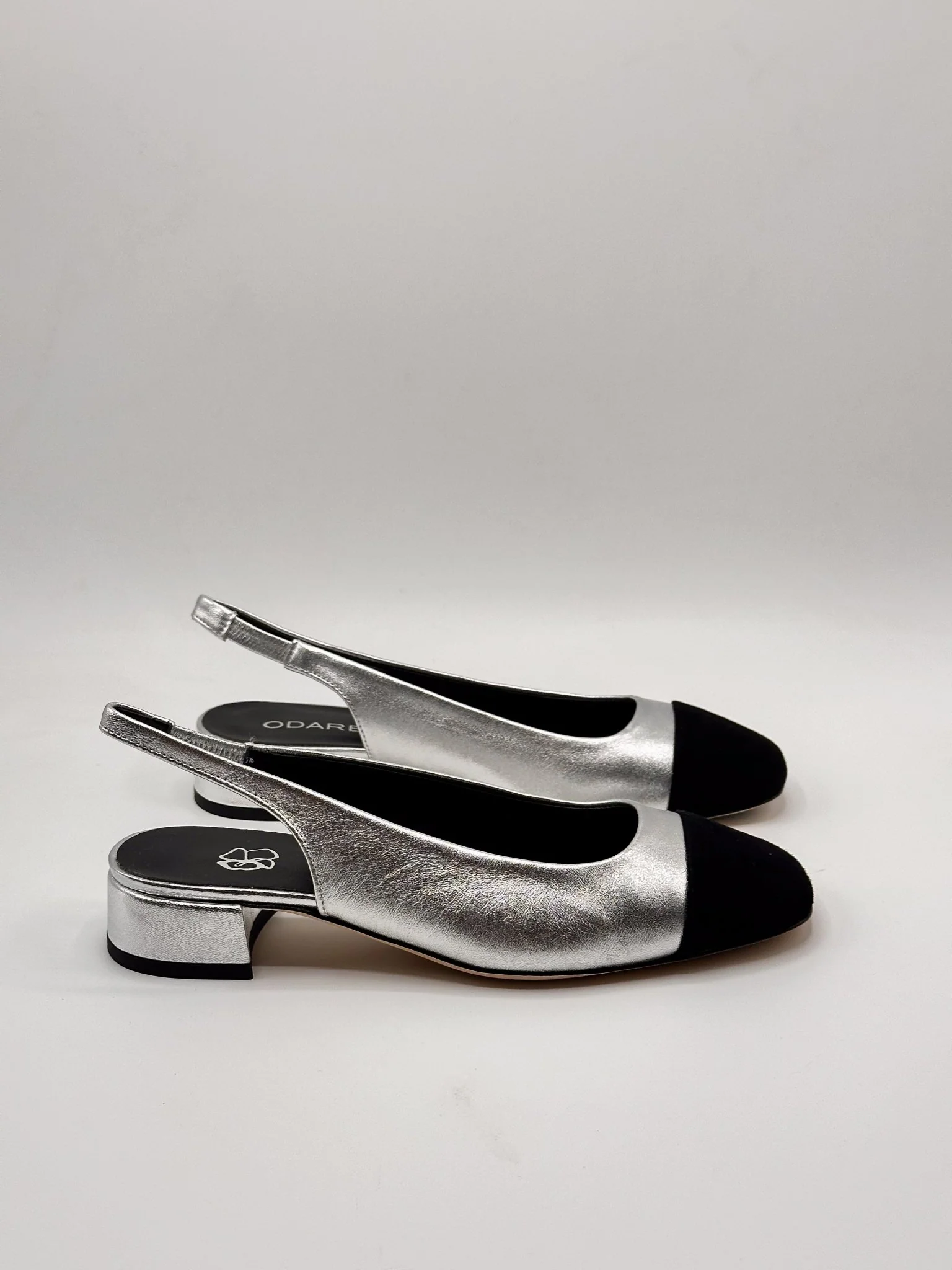 Slingback en cuir argenté et bout en daim noir. Fabriqué en Italie.