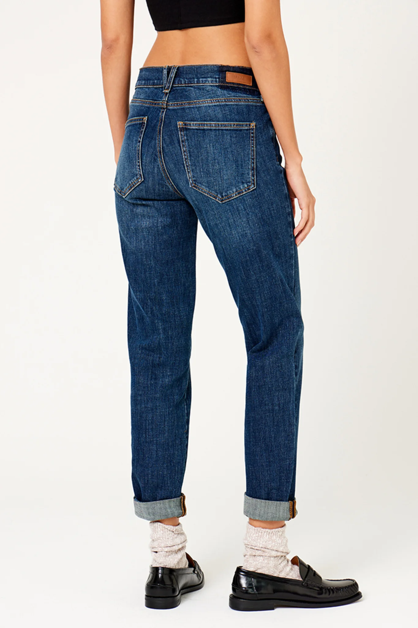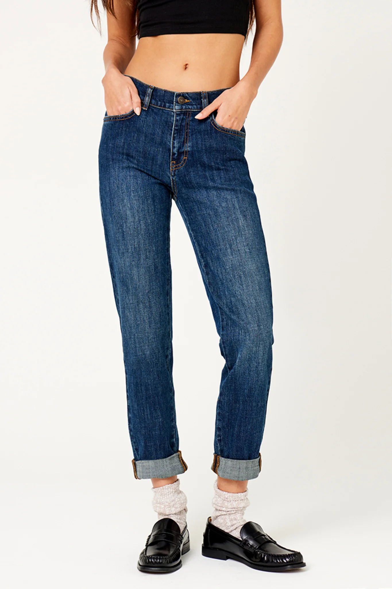 Jean coupe Boyfit Jean 5 poches Taille standard Fermeture avec un bouton FIVE et un zip caché sous le rabat Ceinture avec passants Longueur entrejambe : 72cm Notre mannequin porte une taille 27