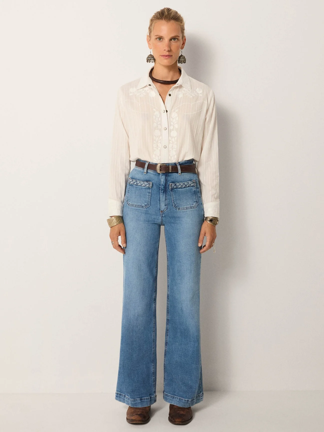 Confectionné en denim de coton lavé, le pantalon Giuletta présente une coupe taille haute avec une légère évasement pour une silhouette flatteuse.