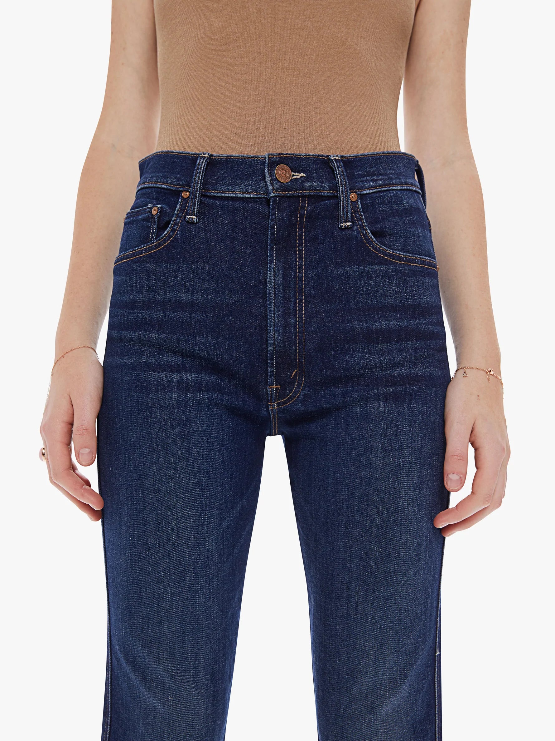 Jean coupe droite. Taille haute. Contient du stretch. Off Limits est un délavage bleu foncé avec une décoloration et des moustaches subtiles.