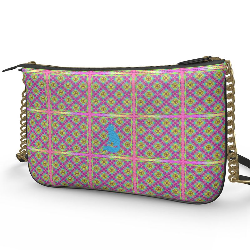Pochette double de designer Cuir Nappa véritable, doublé en fausse suédine 15.5 x 23.5 x 4.5 cm Passepoil et sangle noirs Sangle à clip ou à chaîne au choix Faite à la main à la commande Conseils d’entretien