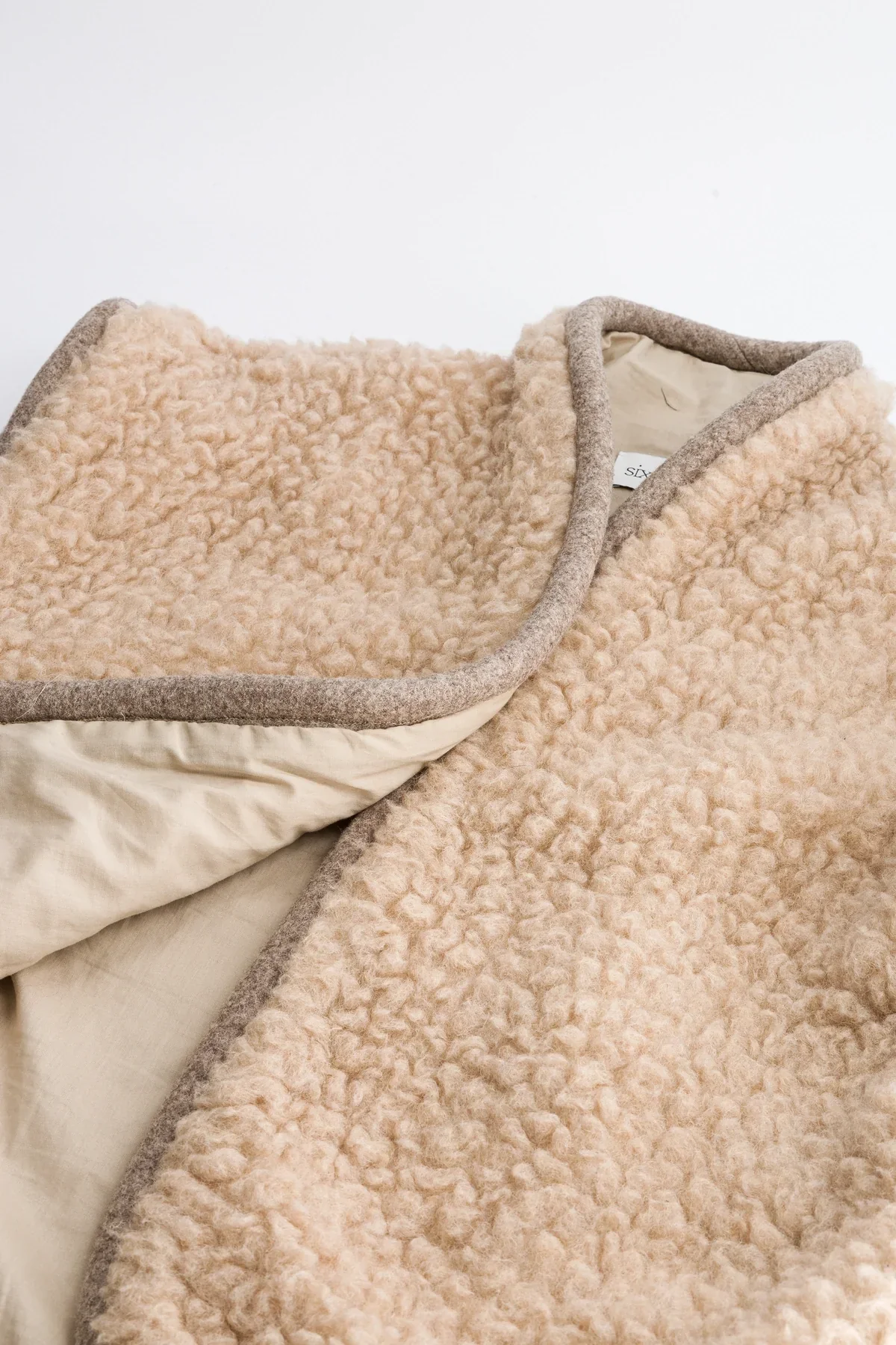Veste sans manche laine moumoute beige. Contour bordé d’une ganse ouatinée recouverte d’un lainage beige chiné.