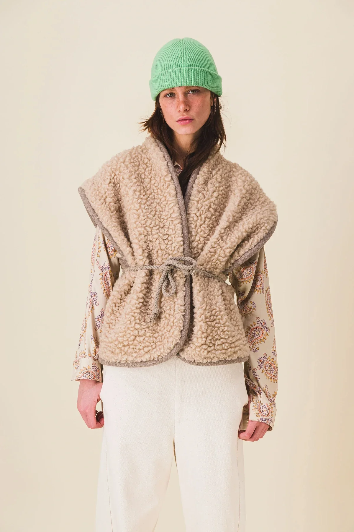 Veste sans manche laine moumoute beige. Contour bordé d’une ganse ouatinée recouverte d’un lainage beige chiné. Se ferme avec corde assortie. Lainage italien, doublure coton. Un vêtement fabriqué en France à Paris.